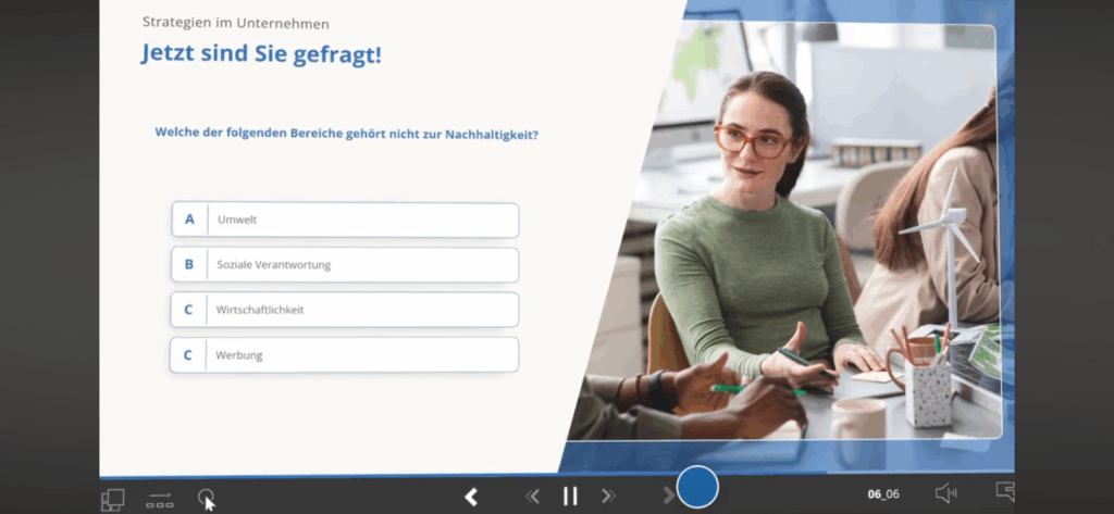 In unserem E-Learning Nachhaltigkeit wird nicht abstrakt erklärt, sondern praxisnah und handlungsorientiert vermittelt. So entsteht echte Umsetzungskompetenz statt reinem Theorie-Wissen.Im unserem Video erhältst du einen Einblick in Inhalte, Aufbau und Nutzen des Trainings!